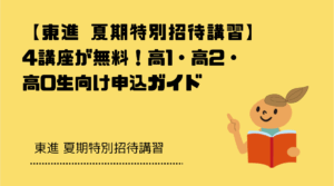 【東進 夏期特別招待講習】4講座が無料!高1・高2・高0生向け申込ガイド ※高0生というのは、高校生レベルの学力を持つ中学生のことです。 「東進の夏期特別招待講習は4講座が無料らしいけど、実際はどうなんだろう?」 「申し込みで失敗や後悔...