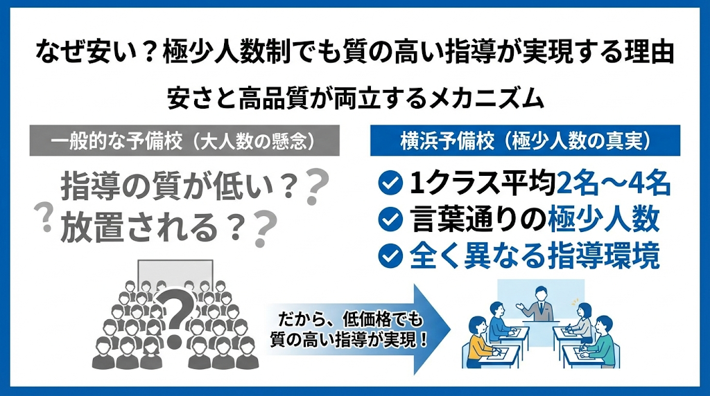 安価な学費を見ると、このような不安を抱くのは当然の心理です。しかし、横浜予備校の最大の特徴は、低価格でありながら「極少人数制」を貫いている点にあります。ここでは、安さと高品質が両立するメカニズムについて解説します。